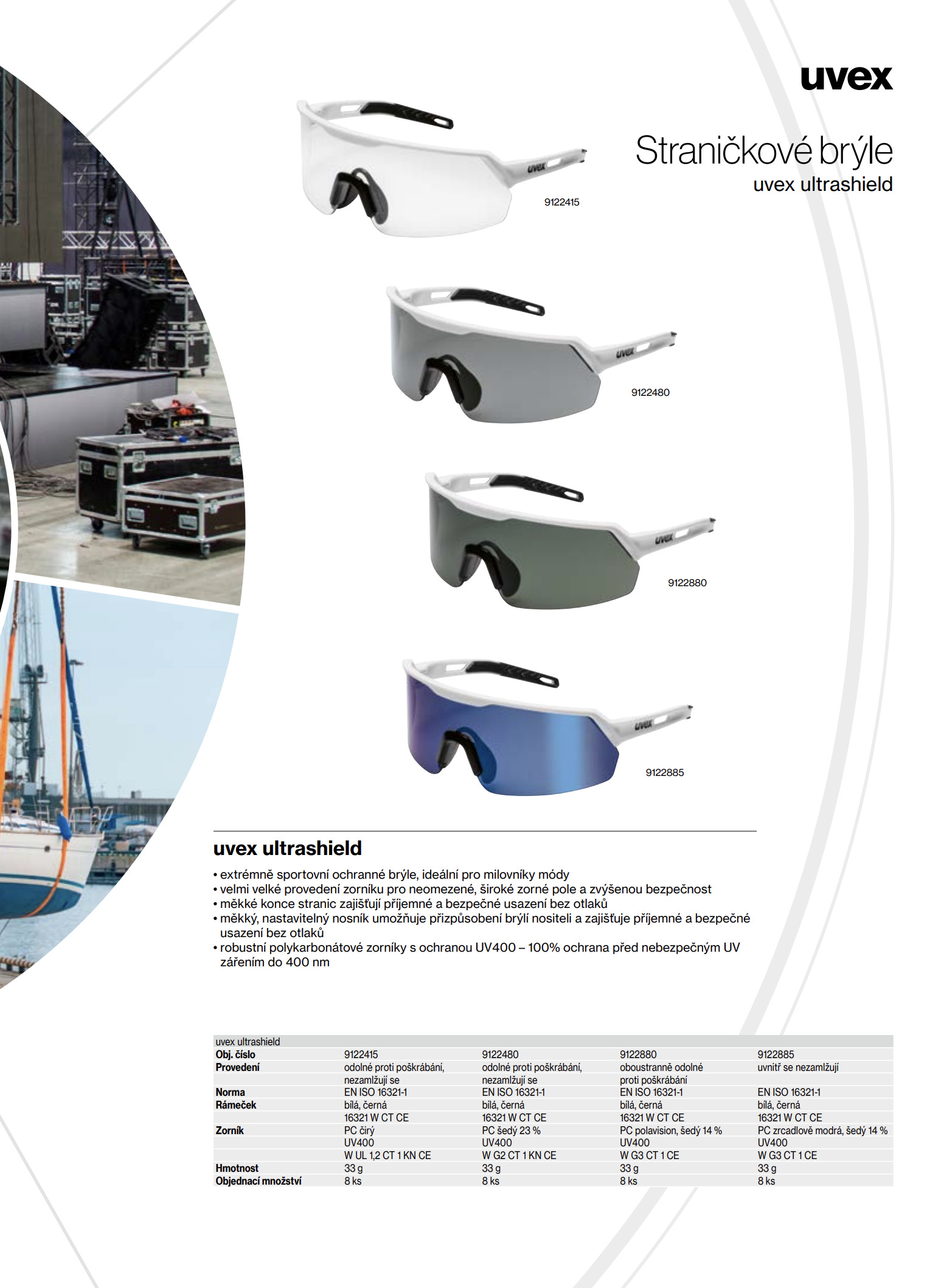Ochranné brýle uvex ultrashield jsou vybaveny velkým panoramatickým polykarbonátovým zorníkem s modrým zrcadlovým tónováním a 14% propustností světla, který poskytuje široké zorné pole a účinnou ochranu proti oslnění. Zorník má antifog úpravu, která zabraňuje zamlžování zevnitř a zajišťuje jasný výhled i v náročných podmínkách. Brýle poskytují UV400 ochranu, tedy 100% filtraci UV záření do 400 nm, a splňují bezpečnostní normy EN ISO 16321-1 a EN 166:2001. Rámeček je vyroben z odolného plastu v kombinaci bílé a černé barvy, přičemž měkké protiskluzové konce stranic zajišťují stabilní a pohodlné usazení bez otlaků. Nastavitelný měkký nosník umožňuje individuální přizpůsobení tvaru obličeje a zvyšuje komfort při dlouhodobém nošení. Brýle jsou vybaveny integrovanou boční ochranou a robustním zorníkem odolným proti nárazům. Filtr W G3 chrání proti oslnění a slunečnímu záření. Pro zachování optimálních vlastností doporučujeme brýle skladovat v suchu a čistotě, ideálně v ochranném pouzdře. Při čištění používejte měkký hadřík a speciální čisticí prostředky na polykarbonátové zorníky, aby nedošlo k poškození antifog vrstvy.