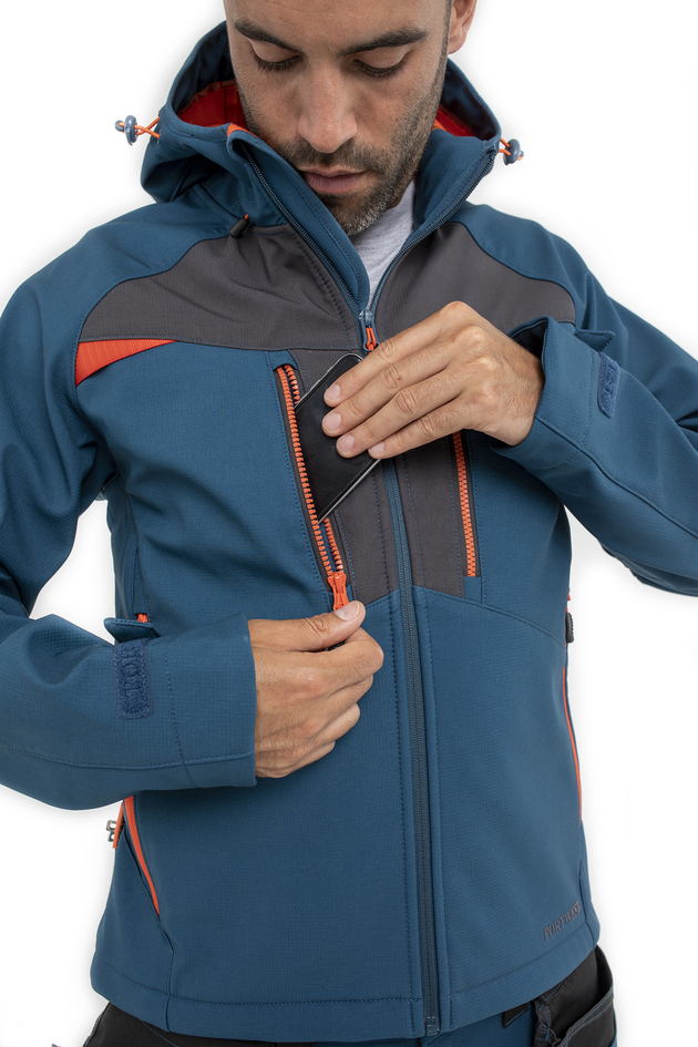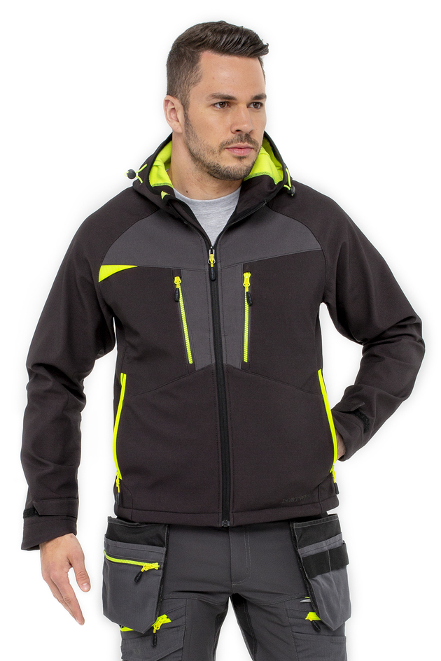 Softshellová bunda ve sportovním designu pro moderní pracovní prostředí, kde se klade důraz na funkčnost, pohodlí a bezpečnost