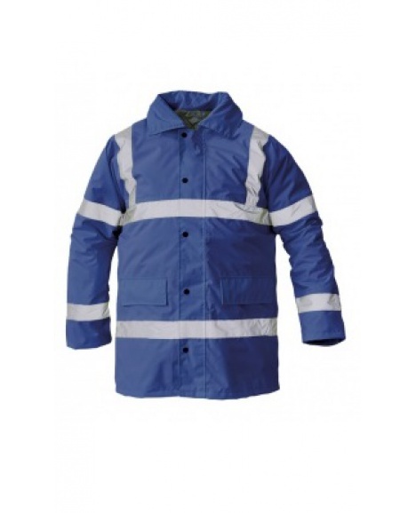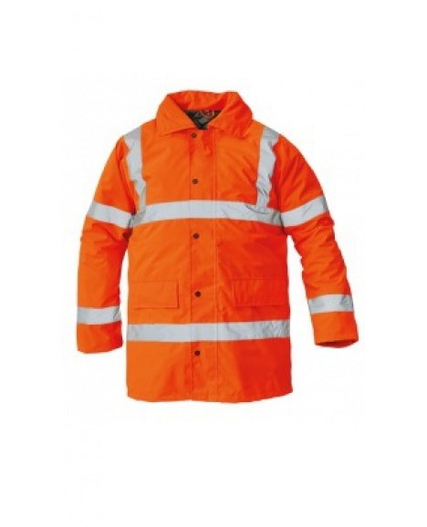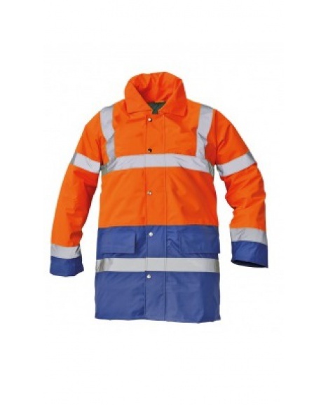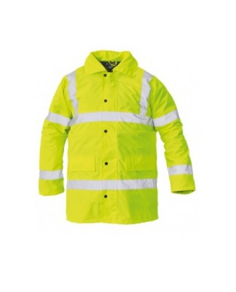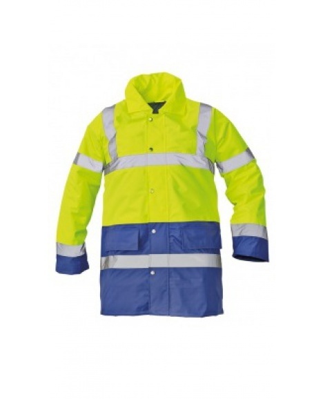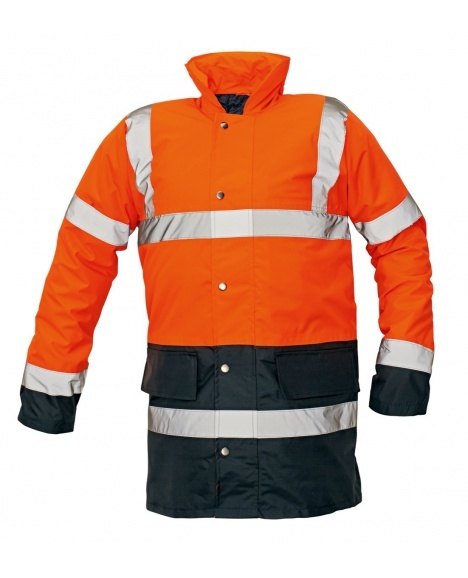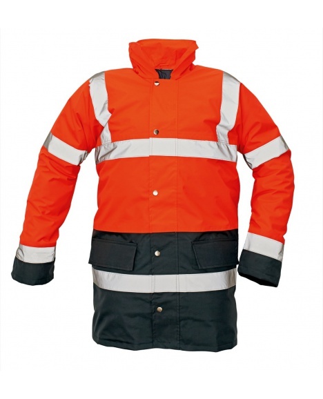 Svrchní materiál tvoří 100% polyester s polyuretanovým povrstvením o gramáži 190g/m², zatímco vnitřní podšívka z taffety a izolace o gramáži 160g/m² zajišťují tepelný komfort. Bunda je prodyšná, voděodolná a větruodolná, s vodním sloupcem 5 000 mm. Integrovaná kapuce chrání před deštěm a větrem, reflexní pruhy na ramenou, hrudníku, bocích i rukávech zvyšují bezpečnost. Dvě prostorné přední kapsy poskytují dostatek místa pro nářadí či osobní věci, obvod bundy lze stáhnout pomocí tkaničky pro lepší přilnutí. Vnitřní pletené manžety zabraňují pronikání chladu do rukávů, konstrukce umožňuje aplikaci firemní výšivky. Bunda je vhodná pro stavebnictví, přepravu, skladování i venkovní údržbu, odolá až 25 pracím cyklům bez ztráty funkčnosti. Splňuje normy EN ISO 20471 (Class 3), EN ISO 13688, EN 342 a EN 343. V této bundě se budete cítit jistě, chráněně a připraveni na každý pracovní den.