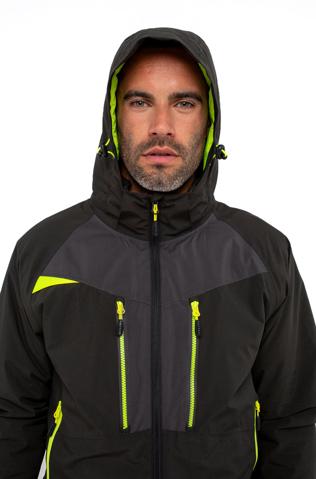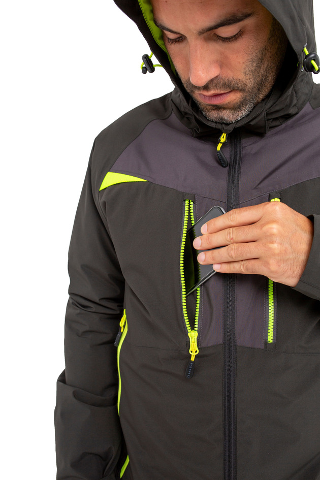 DX460-DX4 nabízí pět kapes: hrudní kapsu, boční kapsy na zip, kapsu na mobilní telefon a vnitřní kapsu. Všechny zipy mají stahováky pro snadnou manipulaci i v rukavicích. Kontrastní barvy a prémiové zipy dodávají bundě moderní vzhled, který oceníte nejen v práci.