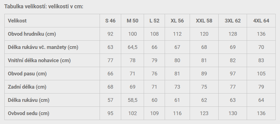 Tento oděv je možné ušít zakázkově podle dodaných velikostí v nestandardních velikostech.
