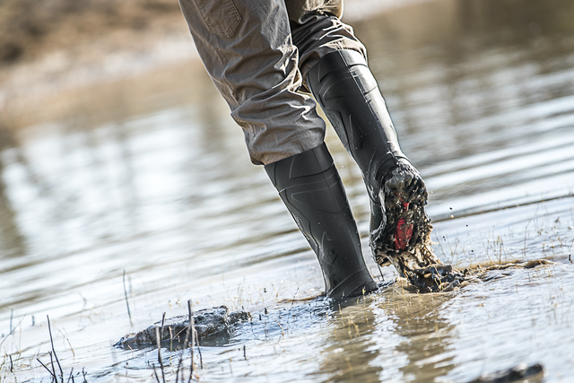 Obuv je odolná proti průniku vody. Například holinky nebo obuv s membránou GORE-TEX.
