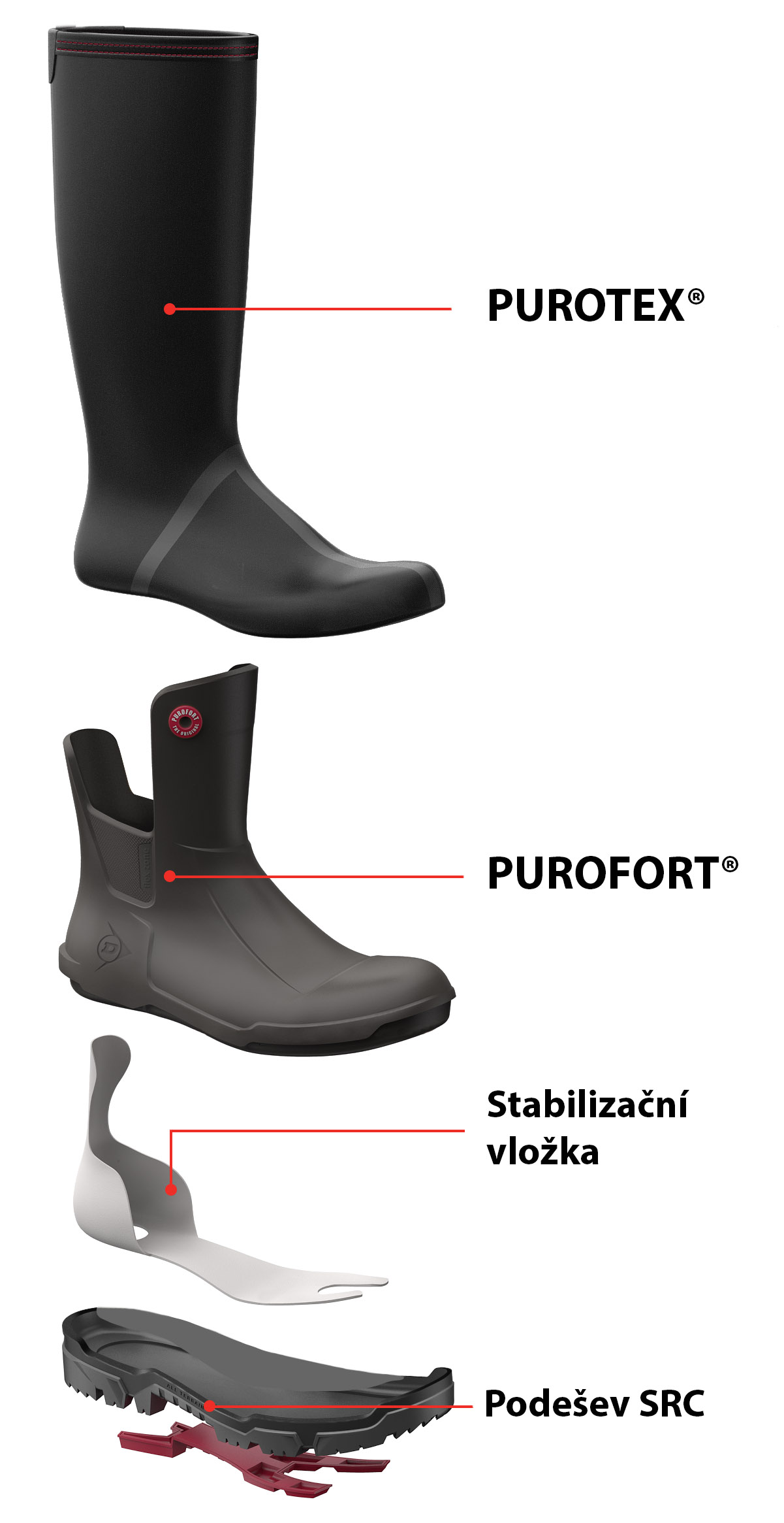 Spodní část holínek je vyrobena z osvědčeného materiálu PUROFORT®, který obsahuje miliony vzduchových kapsiček. Ty zajišťují výjimečnou tepelnou izolaci až do -50 °C a zároveň výrazně snižují hmotnost – holínky jsou až o 30% lehčí než klasické gumové modely. Vnitřní část tvoří PUROTEX®, čtyřvrstvý systém s prodyšným a vodotěsným svrškem. Každá vrstva má specifickou funkci: odpuzování vody, nepromokavost, odvod vlhkosti a odolnost proti oděru.
