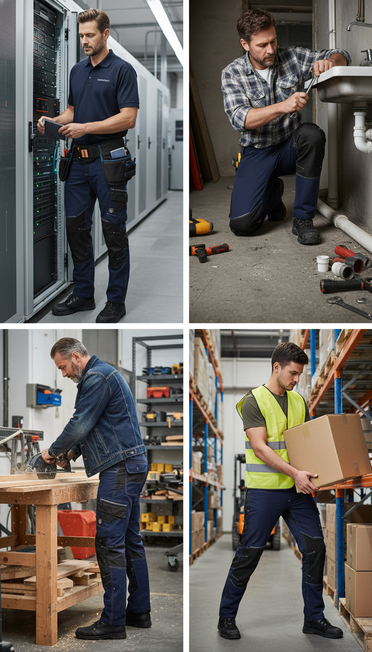Moderní slim střih s nízkým sedem vytváří elegantní siluetu, ale neznamená omezení pohybu. Díky pružnému materiálu máte plnou volnost při ohýbání, dřepu nebo práci ve výškách. Úzké nohavice nepřekáží v úzkých prostorech a působíte profesionálně – ať už jednáte se zákazníkem, nebo montujete rozvaděč.