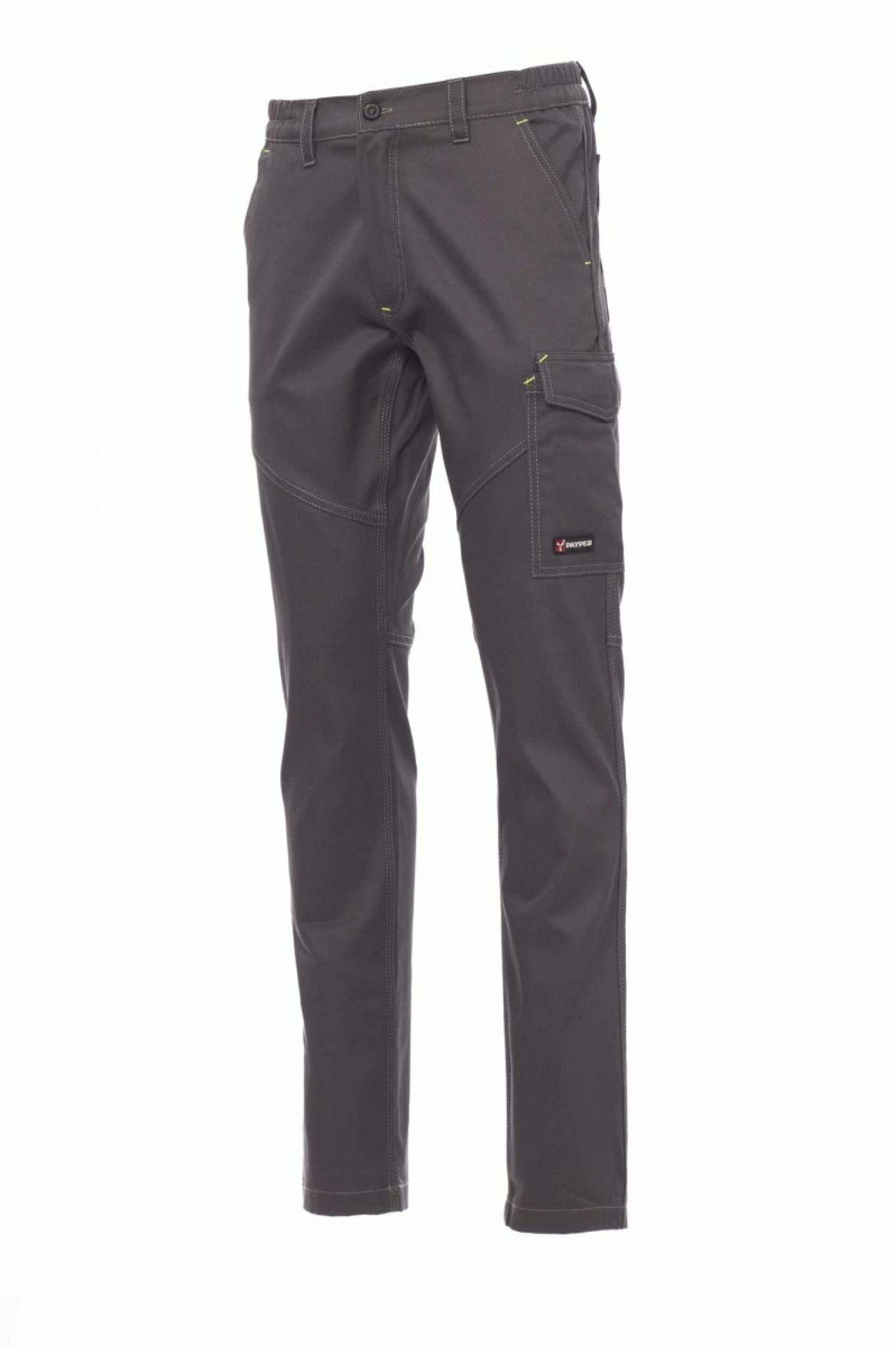 Kalhoty jsou vybaveny dvěma předními kapsami klasického střihu, postranní kapsou LOCK SYSTEM, kapsou na svinovací metr a dvěma zadními kapsami – jedna otevřená, druhá s klopou na suchý zip. Kontrastní vsadky a prošití dodávají kalhotám moderní vzhled, zatímco reflexní pruhy na zadní kapse zvyšují bezpečnost. Prošití trojjehlou a zesílené švy v tónu se žlutou fluo výztuží (u varianty Total Black) zajišťují dlouhou životnost i při náročném používání.