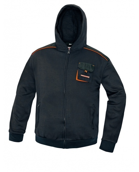 Mikina EMERTON s kapucí je navržena s důrazem na funkčnost a pohodlí. Má úplety na konci rukávů a na spodním lemu, což zajišťuje lepší přizpůsobení a udržení tepla. Mikina se zapíná na zip a nabízí tři praktické kapsy – dvě boční na zip a jednu náprsní kapsu. Design je doplněn tenkými oranžovými pruhy na ramenech, které přidávají stylový akcent.