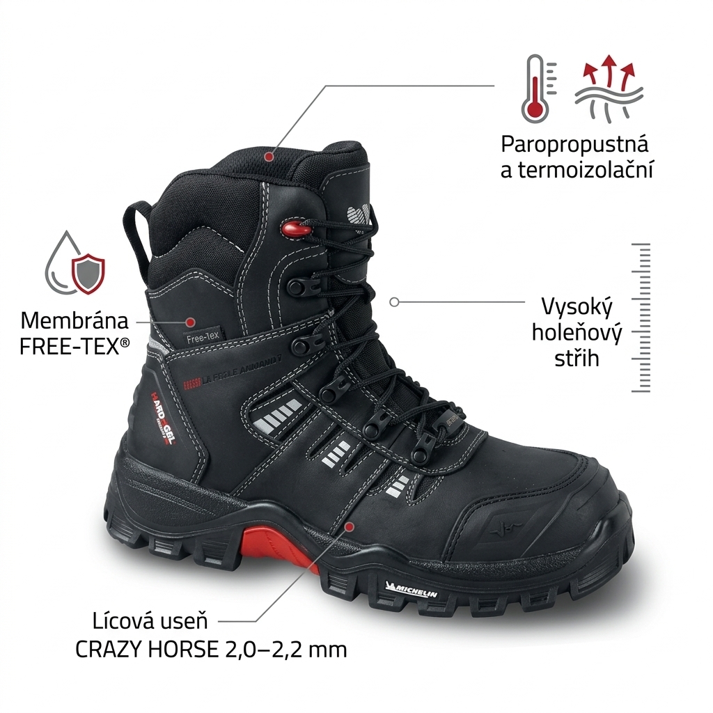 Holeňová pracovní obuv se svrškem z lícové usně CRAZY HORSE a membránou FREE-TEX® udrží nohy suché a v teple za každého počasí. Podešev Michelin® PU/Rubber odolává kontaktnímu teplu do 300 °C, palivovým olejům a splňuje protiskluzovou normu SRC. Certifikovaná dle ČSN EN ISO 20347:2012 v klasifikaci O2 FO HRO SRC CI WR – bez kovových prvků
