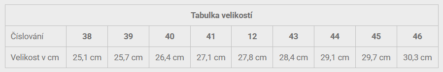| Velikostní rozpětí | 38 – 47 |