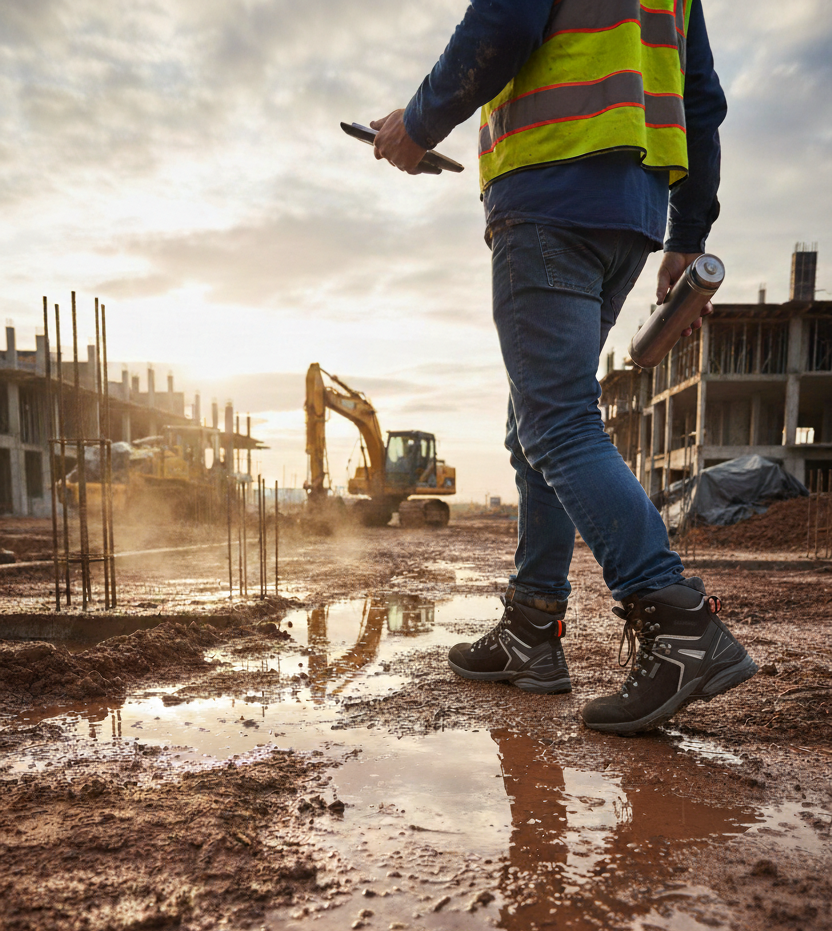 Membrána REGI-TEX® funguje jako neviditelná bariéra – propouští pot ven, ale vodu dovnitř nepustí. Představte si ranní obchůzku stavby po nočním dešti, brodění se bahnem na lesní cestě nebo při práci venku. Zatímco kolegové s levnými botami mají mokré ponožky a studené nohy, vy zůstáváte v suchu. Voděodpudivá nubukovaná hovězina navíc odpuzuje vodu už na povrchu, takže se boty nepromáčejí ani zvenčí. Ochranný TPU díl v patní části zajišťuje, že kotník má pevnou oporu při každém kroku – ať už šlapete po šikmém terénu, po žebříku nebo schodech. Odpružení v patě tlumí nárazy při chůzi a šetří vaše klouby, takže po celém dni na nohou nebudete mít pocit, jako byste chodili po betonu naboso. Podešev RAMMER s certifikací SRA znamená, že neuklouznete ani na mokré dlažbě, mastném betonu nebo bahnitém povrchu – jde o testovanou protiskluznost podle normy. Stélka ABSORBA XTR s aktivním uhlím eliminuje zápach a vlhkost, takže i po dvanácti hodinách v botách nebudete mít pocit, že máte nohy v sauně. A reflexní prvky po bocích zajistí, že vás řidiči uvidí i za šera nebo v noci – když vyrážíte časně ráno na stavbu nebo se vracíte po setmění z terénu, každý detail viditelnosti počítá.