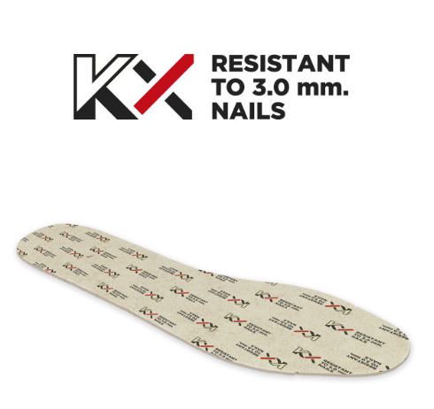 Nekovová antiperforační vložka KX odolá propíchnutí silou přes 1 100 N při testu s 3,0 mm kuželovým hřebem a chrání celé chodidlo – nejen střed. Flexibilní a pohodlná i při celodenním nošení.
