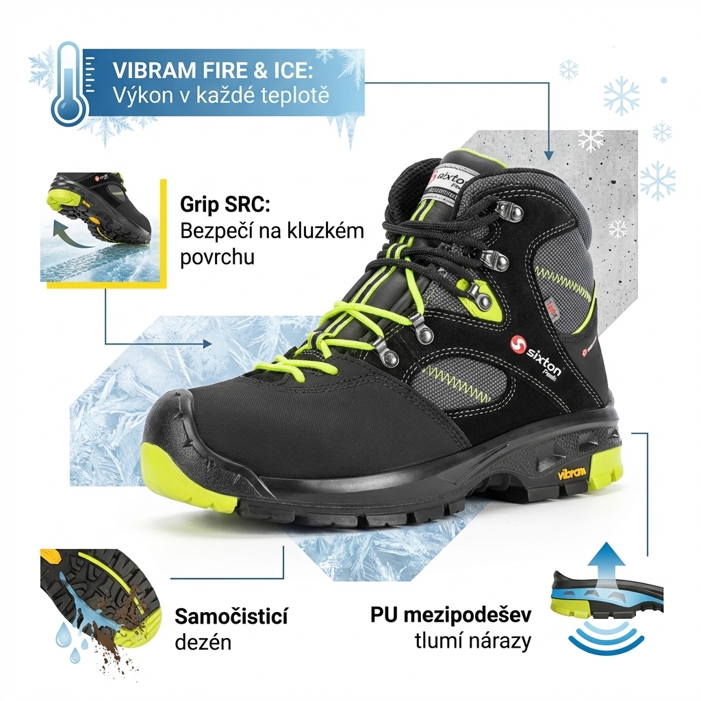 Představte si ráno v listopadu – zmrzlá betonová plocha, lehký sníh. Podrážka z kombinace PU a gumy VIBRAM FIRE & ICE je navržena tak, aby podávala maximální výkon v celém rozsahu teplot, nejen v létě. Samočisticí dezén s certifikovaným gripem SRC (odolnost na kluzké keramické i ocelové ploše) zajišťuje, že každý krok je pevný a kontrolovaný. Lehká PU pěnová mezipodešev navíc tlumí nárazy a šetří klouby.