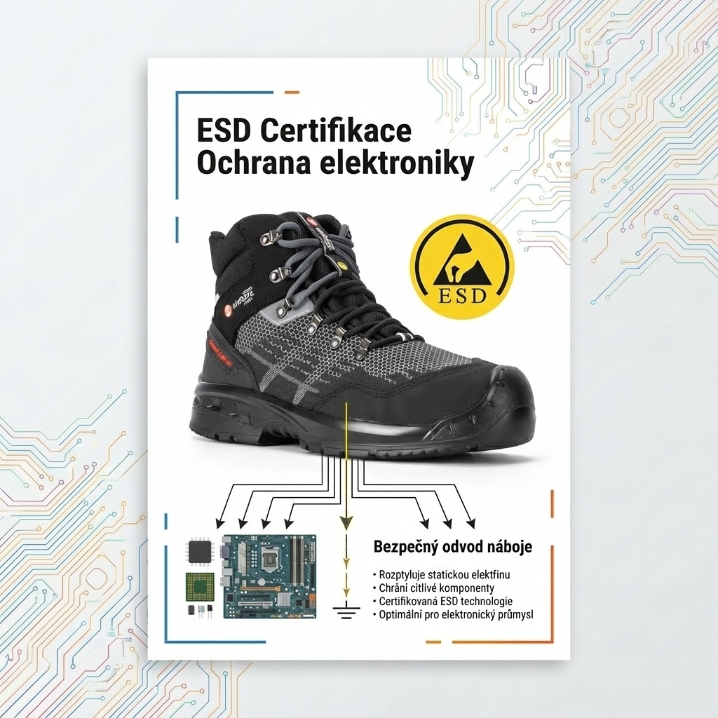 Bota je certifikována jako ESD (ElectroStatic Discharge) v souladu s normami IEC EN 61340-5-1:2016, IEC EN 61340-4-3:2018 a IEC EN 61340-4-5:2018. Statická elektřina, která se hromadí při pohybu, se bezpečně odvádí přes podrážku – a neohrožuje citlivé elektronické komponenty, se kterými přicházíte do kontaktu. Pro elektrikáře, techniky nebo pracovníky v průmyslu s elektronikou je to vlastnost, která se nedá přehlédnout.