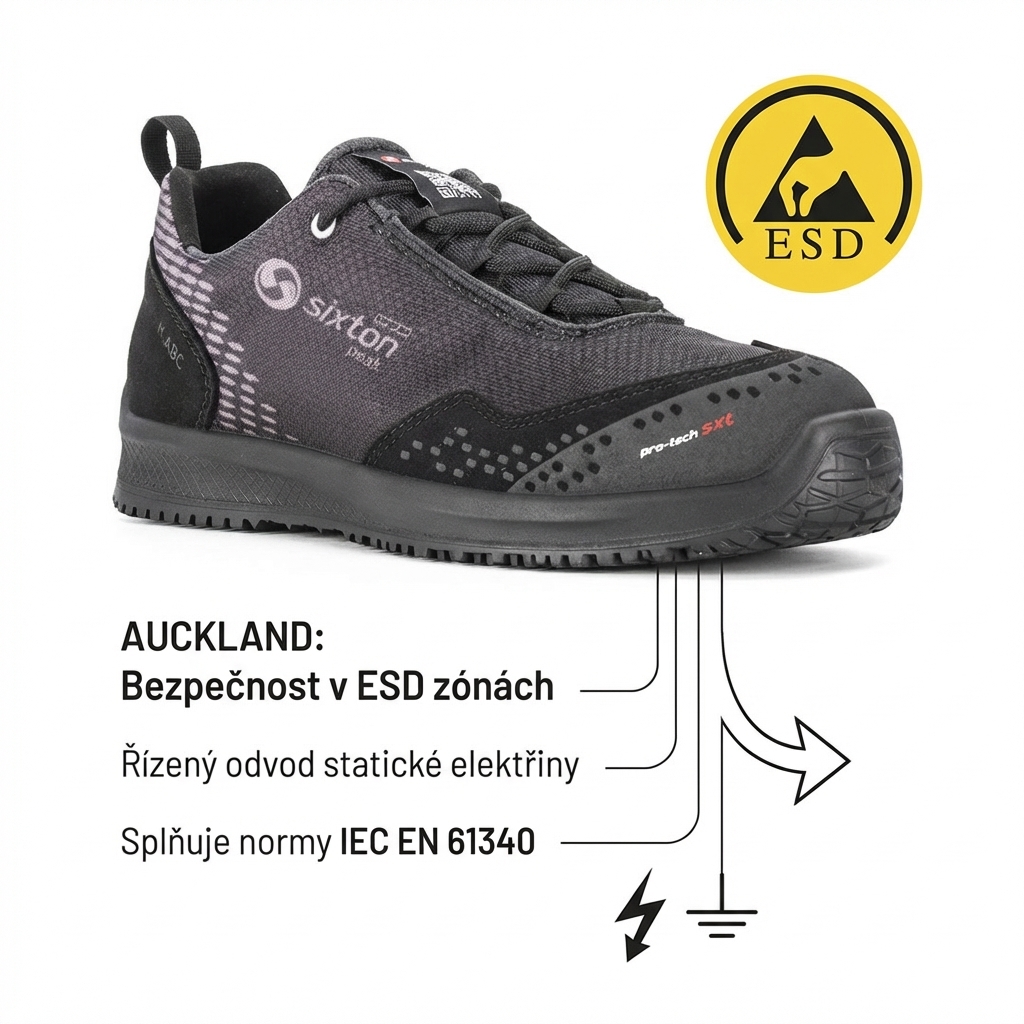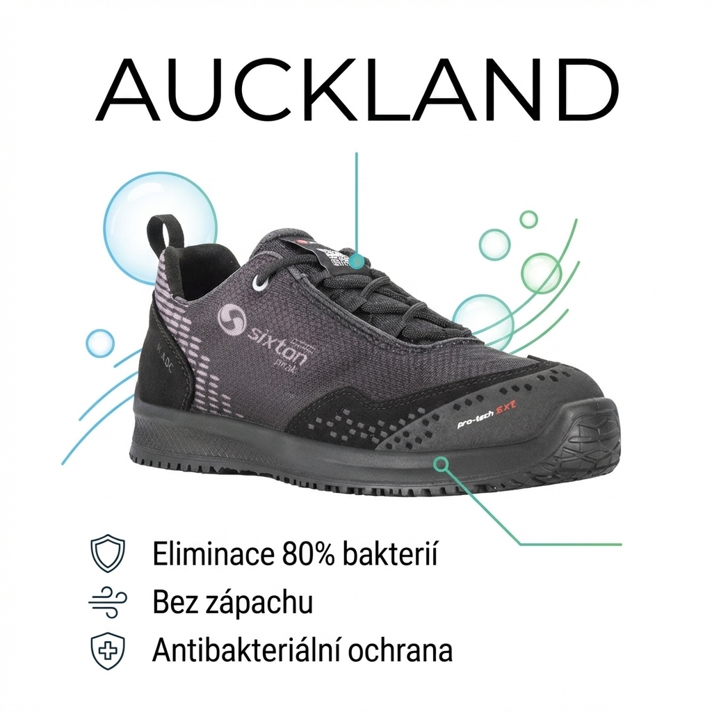 Stojíte celou směnu na nohách, podlaha je mokrá od vody nebo tuku a vy potřebujete vědět, že vás bota podrží – doslova. AUCKLAND od Sixton Peak je pracovní obuv navržená přesně pro prostředí, kde standardní podrážka nestačí. Kombinuje extrémní přilnavost podrážky VIBRAM s antibakteriální ochranou, ESD vlastnostmi a anatomickou stélkou s paměťovou pěnou. Výsledek? Nohy, které vás po dvanáctihodinové směně ještě poslechnou.