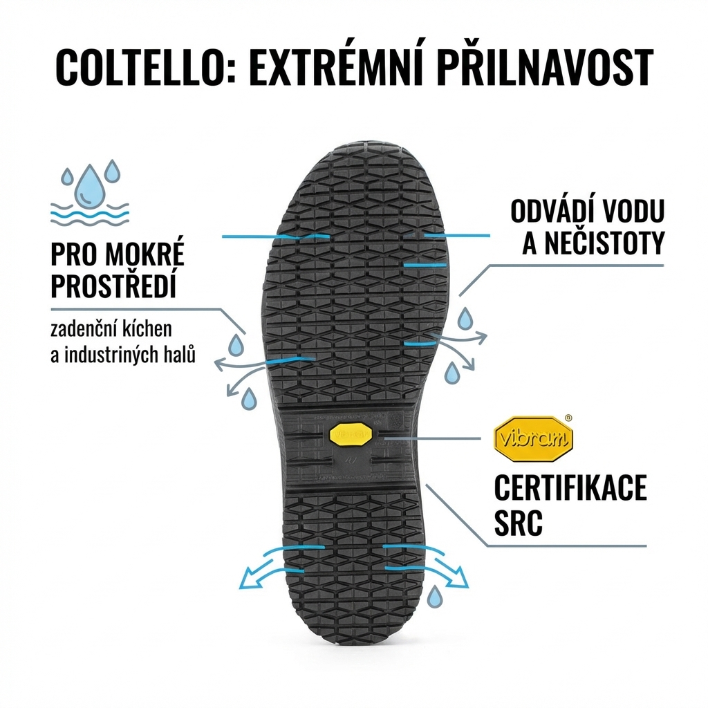 Kuchyně, výrobní hala, mokrý sklad – místa, kde jedna špatná chvíle může znamenat vážný pád. Podrážka PU-Rubber VIBRAM s designem COLTELLO je navržena speciálně pro extrémně kluzké a mokré pracovní podmínky. Vzorek podrážky odvádí vodu a nečistoty pryč od kontaktní plochy, takže přilnavost zůstává konstantní i tam, kde jiné boty selhávají. Certifikace SRC potvrzuje nejvyšší stupeň protiskluznosti podle evropských norem.