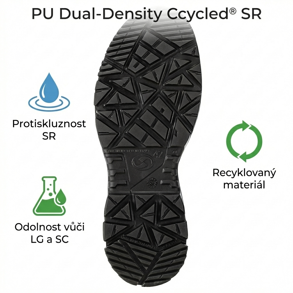 Představte si mokrý beton po dešti nebo mastnou podlahu v dílně. Dvoukomponentní polyuretanová podrážka PU Dual-Density Ccycled® SR je navržena přesně pro takové podmínky. Splňuje požadavky LG (odolnost vůči pohonným hmotám a uhlovodíkům) a SC (odolnost vůči chemikáliím), a navíc má protiskluzové vlastnosti SR. Podrážka je přitom vyrobena z recyklovaného materiálu Ccycled® – pevnost a výdrž bez zbytečného plýtvání.
