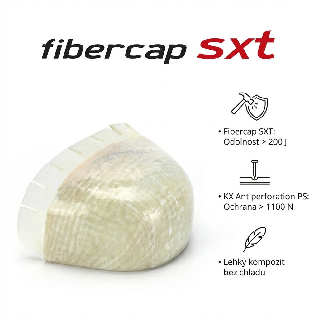 Kompozitní špička ze skelného vlákna Fibercap SXT odolá nárazu přes 200 J – to je padající předmět o hmotnosti zhruba 20 kg z výšky jednoho metru. Protipropichová vložka KX Antiperforation PS odolá síle přes 1 100 N při standardizovaném hřebíku s průměrem 3,0 mm. Ochrana pokrývá celou plochu chodidla. A protože jde o kompozit, ne ocel – bota neváží zbytečně navíc a nepřenáší chlad.