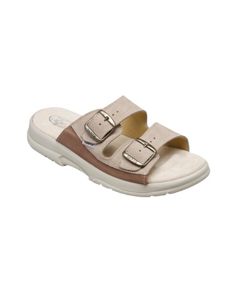 Anatomicky tvarované pantofle s kožovým svrškem a stélkou, která podpírá klenbu a předchází plochým nohám. Dvě nastavitelné přezky zajistí individuální přizpůsobení a protiskluzová podešev stabilitu bez šmouh na podlaze