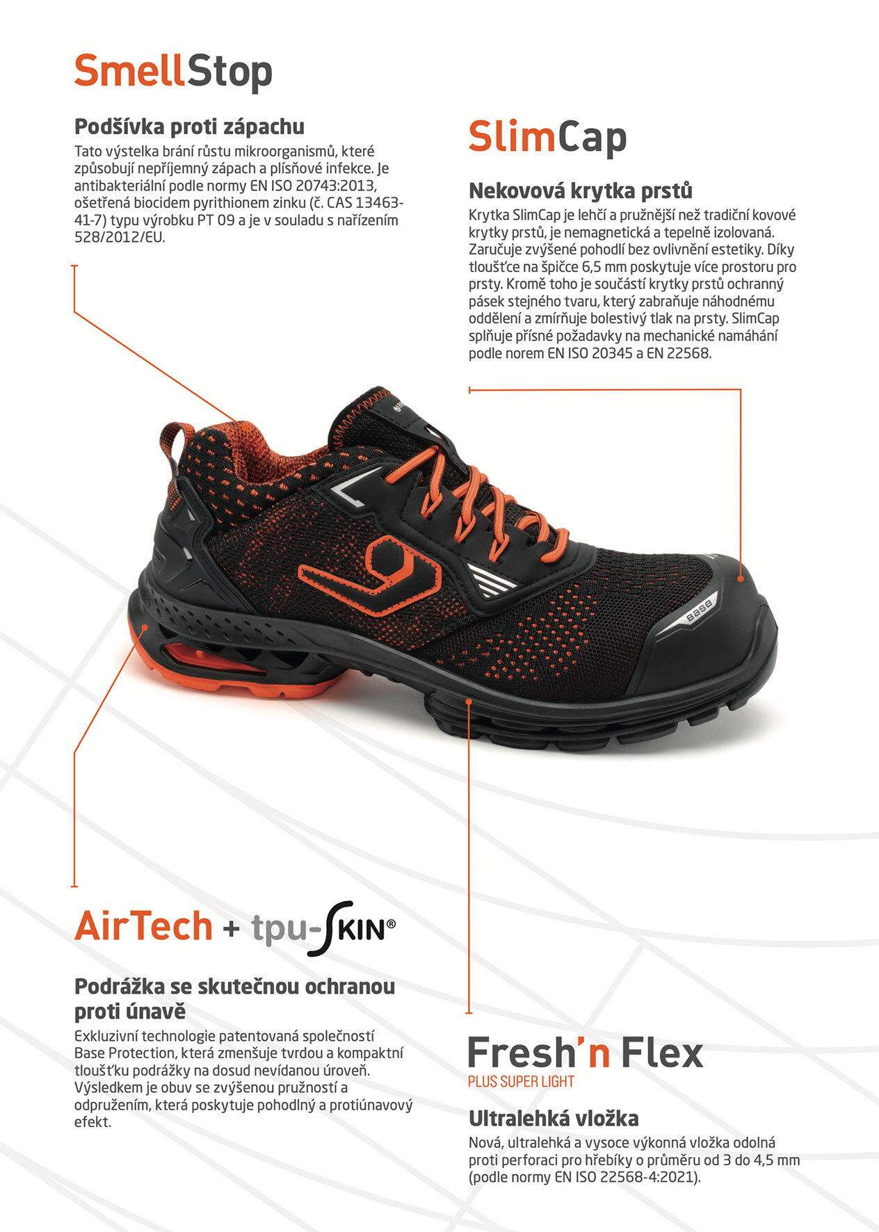 Polobotky BASE NEW YORK z kolekce RUN@WORK spojují moderní design s pokročilými funkcemi. Antibakteriální podšívka SmellStop udržuje svěžest a chrání před vznikem mykóz. Ultralehká vložka Fresh'n Flex Plus chrání proti propíchnutí, zatímco špička SlimCap poskytuje bezpečí bez zbytečné hmotnosti. Protiúnavová podrážka AirTech+Tpu-Skin tlumí nárazy a zajišťuje pružnost při každém kroku. Díky antistatickým vlastnostem jsou ideální i pro práci s elektronikou.