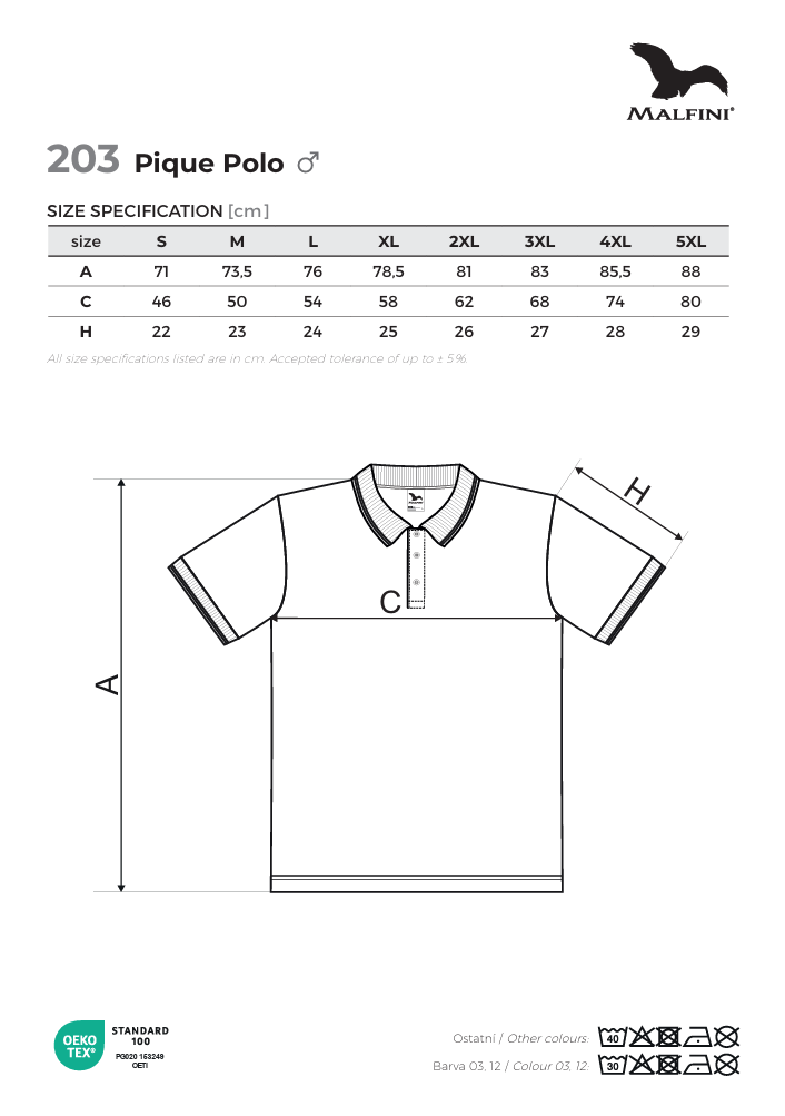 Polokošile MALFINI PIQUE POLO 203 je vyrobena z kvalitního materiálu z 65% bavlny a 35% polyesteru o gramáži 200g/m². Tato směs materiálů kombinuje výhody bavlny - příjemný pocit na dotek a prodyšnost, s trvanlivostí a odolností polyesteru. Tričko je navíc snadno udržovatelné a lze ho prát na teplotě 40°C, což zaručuje jednoduchou péči a zachování jeho kvality i po mnoha praních.