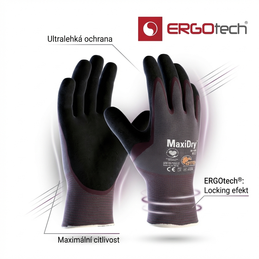 Ultralehká bezešvá pletenina v kombinaci se syntetickým povrstvením vytváří rukavici, která na ruce prakticky necítíte – a přesto chrání. ERGOtech® platforma stojí na dvou principech: minimální hmotnost pro maximální citlivost a elastické zápěstí s „locking" efektem, které drží rukavici přesně na místě. Žádné sjíždění, žádné přetahování zpátky na ruku uprostřed práce. Výsledek? Méně únavy ruky, lepší soustředění na práci a větší přesnost pohybů i po hodinách používání.