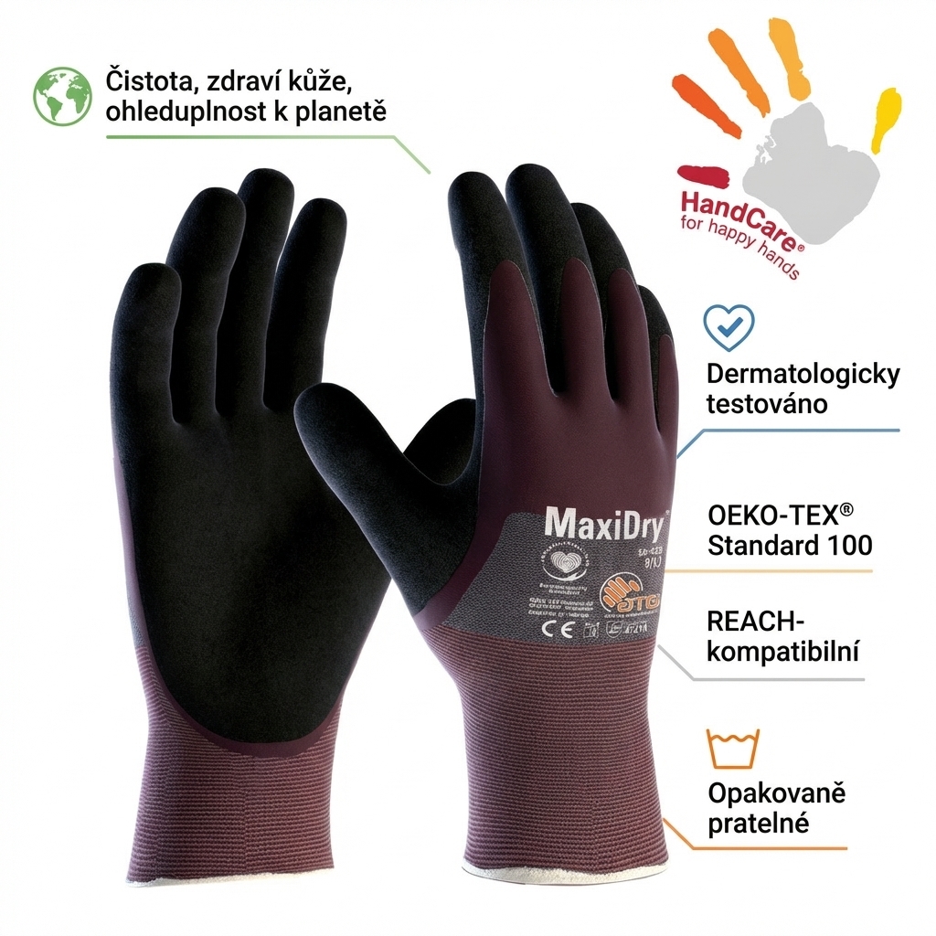 HandCare® je filozofie ATG, která stojí na třech pilířích: čistota, zdraví kůže a ohleduplnost k planetě. Rukavice jsou dermatologicky testovány, certifikovány OEKO-TEX® Standard 100 a vyrobeny výhradně z REACH-kompatibilních materiálů. Navíc je lze prát opakovaně – nemusíte je po jednom použití vyhodit. Ušetříte peníze, snížíte odpad a vaše ruce zůstanou zdravé i po dlouhodobém nošení.