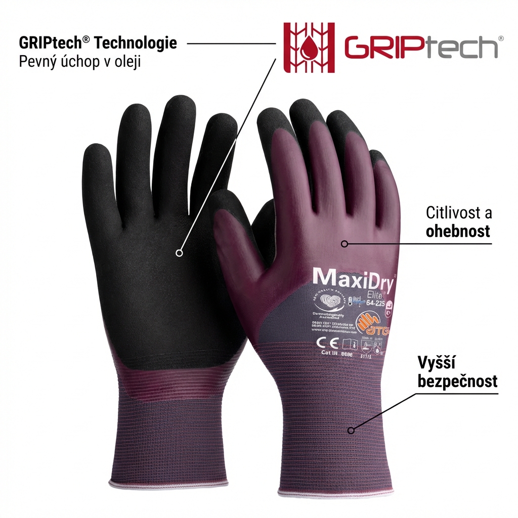 Těžké a neohebné rukavice unavují ruce a snižují produktivitu. MaxiDry Elite jsou ultralehké díky kombinaci syntetického povrstvení a vysoce kvalitního bezešvého pletiva. Technologie ERGOtech® zajišťuje perfektní přilnutí k ruce bez zbytečného materiálu. Elastická podpora v oblasti zápěstí vytváří „uzamykací" efekt, který zabraňuje sklouzávání rukavice během práce. Výsledek? Ruce nejsou unavené ani po osmi hodinách, máte maximální citlivost pro jemné práce a přitom plnou ochranu.