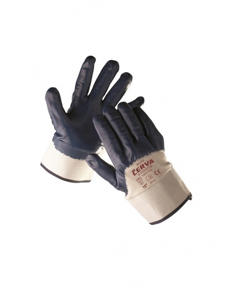 Šité rukavice z bavlněného úpletu povrstvené v nitrilu s tuhou manžetou