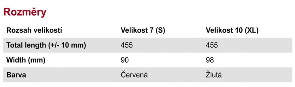 | Dostupné velikosti | Velikost 7 (S), Velikost 10 (XL) |