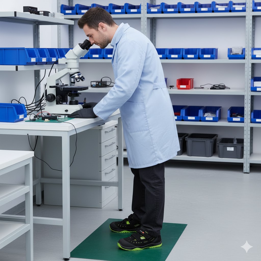 ESD obuv bezpečně odvádí statický náboj a chrání okolní zařízení před poškozením. Je navržena a testována podle norem IEC EN 61340-5-1:2016, IEC EN 61340-4-3:2018 a IEC EN 61340-4-5:2018.