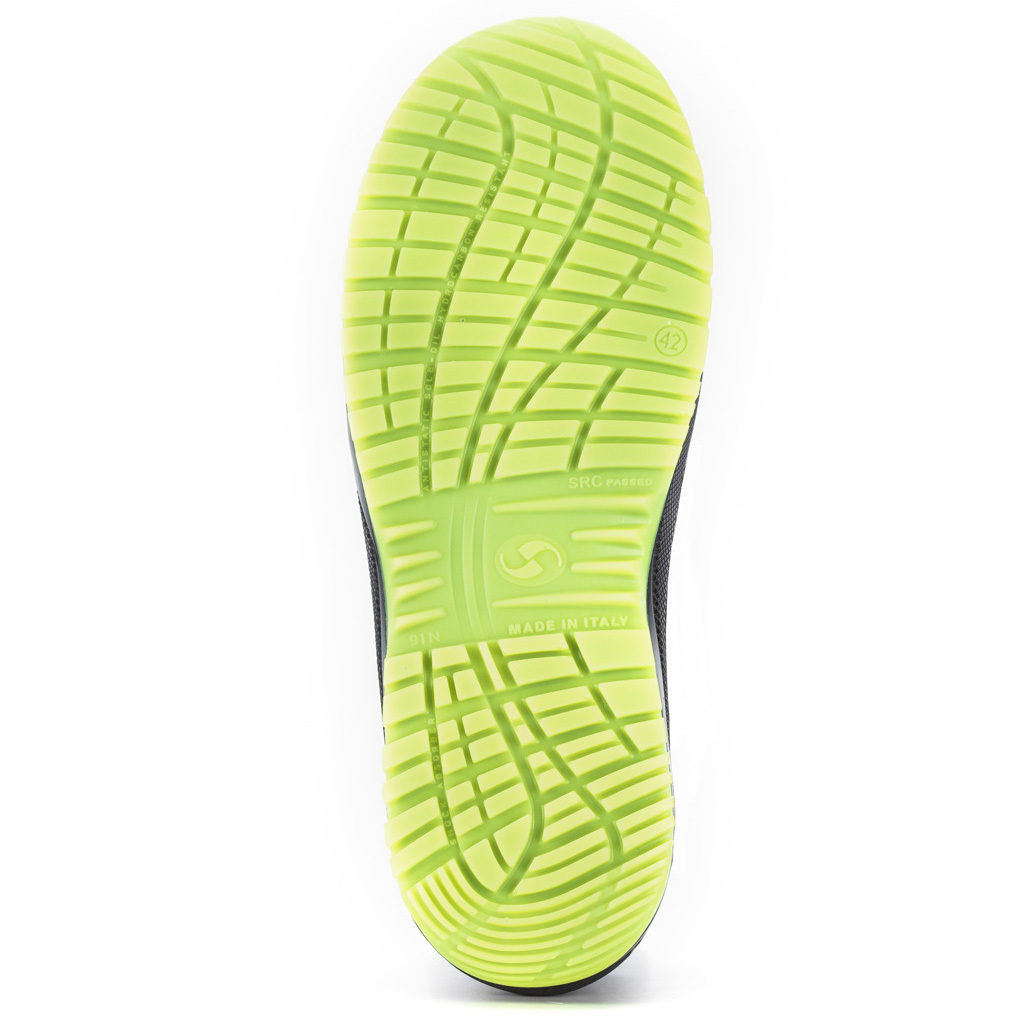 Pracovní obuv Sixton MENEITO S1P je navržena s důrazem na bezpečnost a funkčnost. Horní část tvoří mikrovláknový semiš o tloušťce 1,6–1,8 mm s technologií Pro-tech SXT light a Digitex Airy, která zajišťuje odolnost a lehkost. Hliníková špička Alu SXT 2.0 odolá nárazu až 200 J, zatímco nekovová vložka KX Antiperforační PS chrání proti propíchnutí silou přes 1100 N. Podešev z PU s dvojitou hustotou a ESD směsí splňuje normy IEC EN 61340 a poskytuje maximální protiskluzovou ochranu (SRC standard), ideální pro práci s citlivými elektronickými zařízeními.