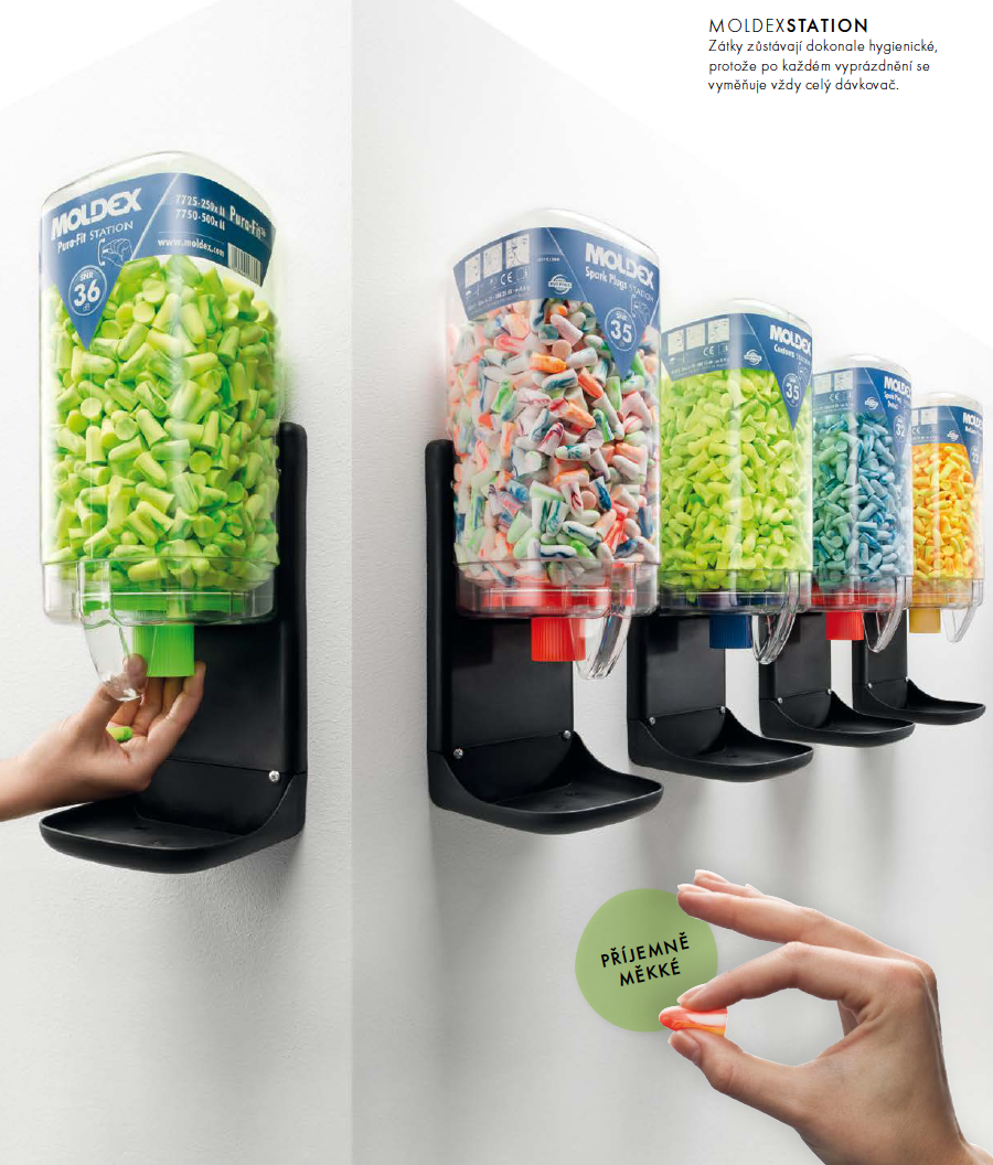 Zásobník obsahuje 500 anatomicky tvarovaných zátek s vysokým útlumem hluku (SNR 35 dB), které poskytují účinnou ochranu sluchu i v extrémně hlučném prostředí. Hygienický dávkovací mechanismus z recyklovatelného materiálu se automaticky vyměňuje při každém doplnění, což zajišťuje čistotu a bezpečnost pro každého uživatele. Díky snadnému použití a dlouhé výdrži se zaměstnanci cítí chráněni, komfortně a jistě – a organizace získává efektivní systém, který šetří čas i náklady.